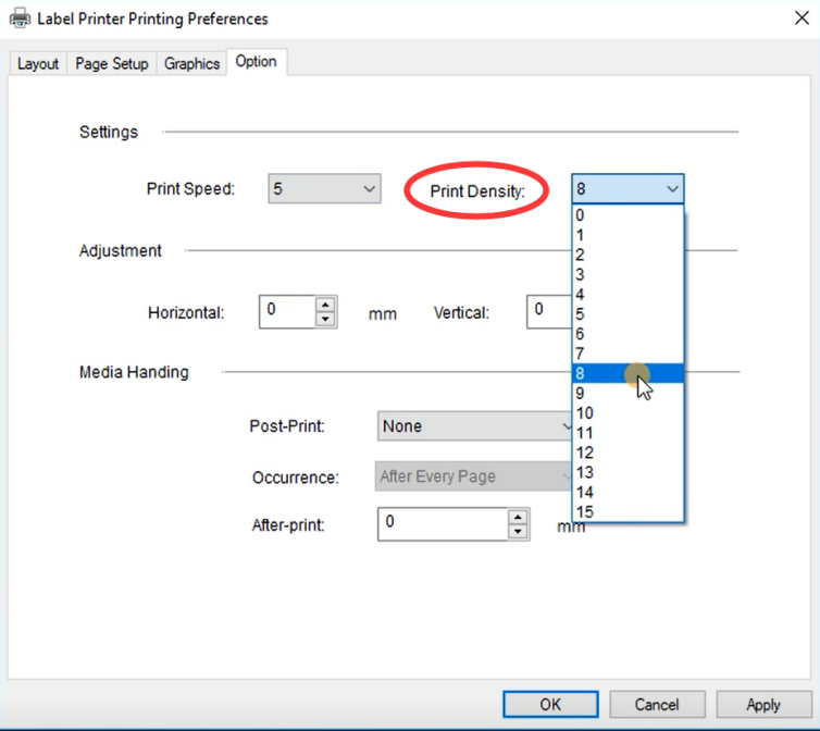 Note: Setting the density too high may cause some unwanted dark lines and/or the label getting too hot and sticking to the printhead.