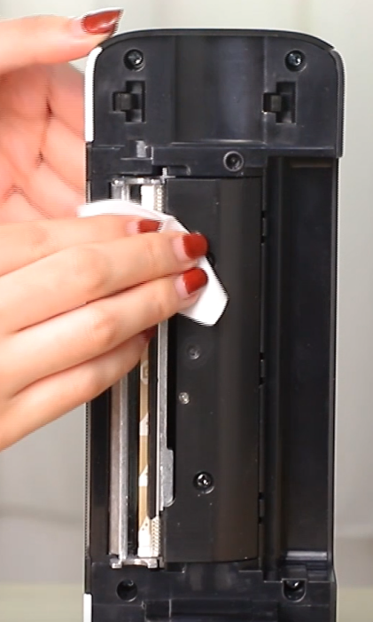 Open Cover and use the alcohol pads to wipe the Printhead and Platen Roller clean. (Any 70% Alcohol pad would work.) Allow 2-3 minutes for components to dry, then close the Cover and turn Label Printer back on.