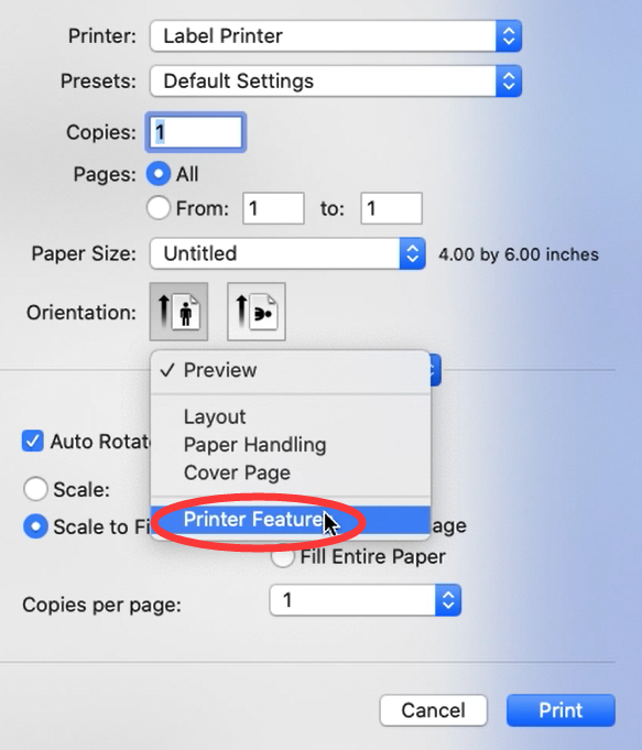 -> Right click on "Label Printer" -> choose "Printer Preferences" -> go to the "Option"