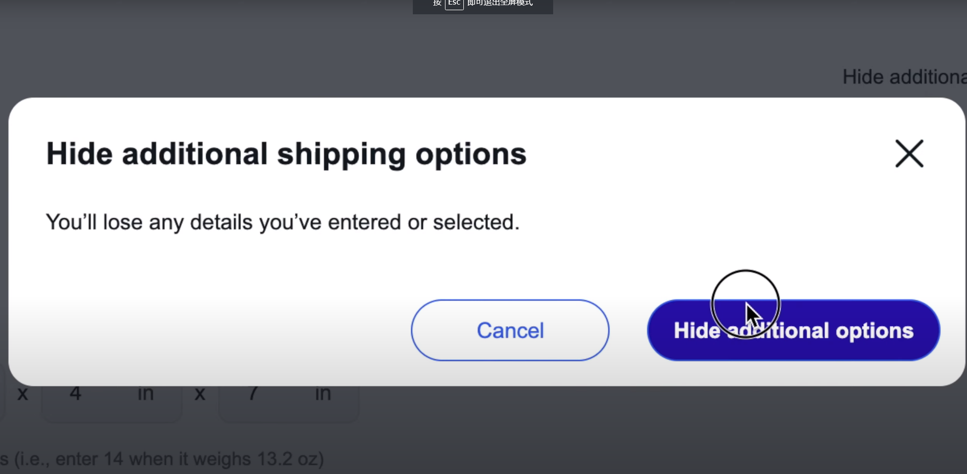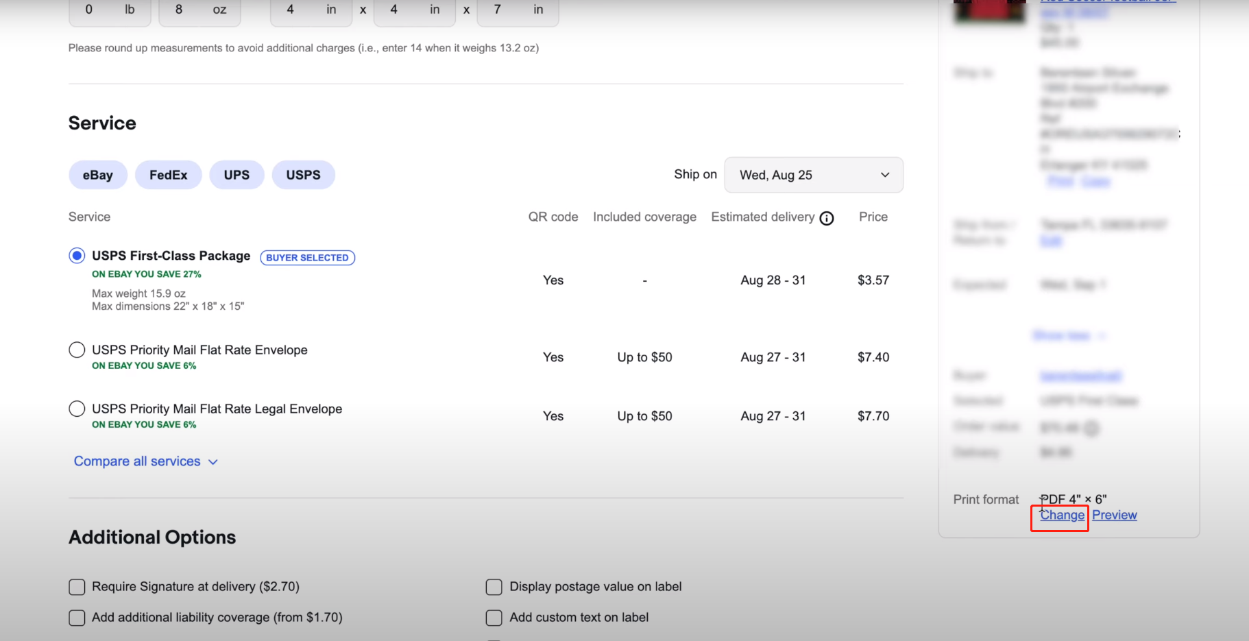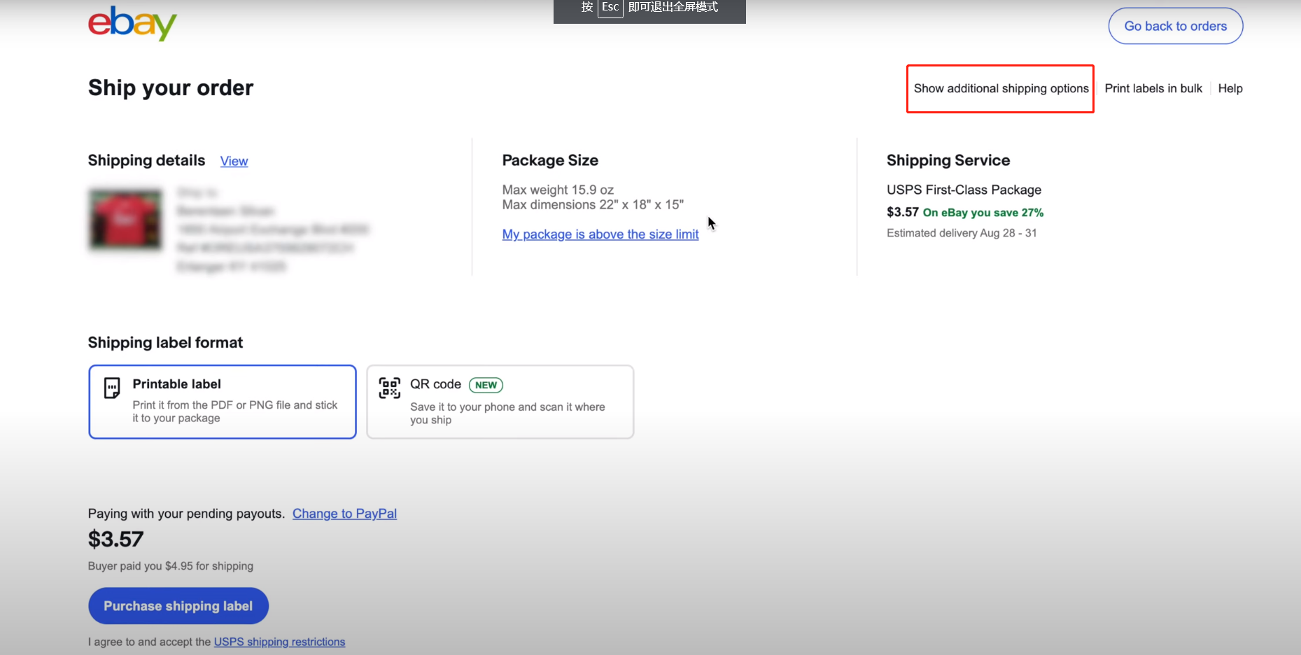 6. Click “Hide additional options”, then click “Purchase shipping label”.