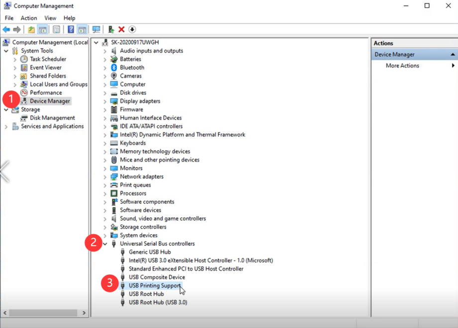 - "Device Manager" -> "Universal Serial Bus controllers" -> Double click on "USB Printing Support" to check which USB port is connected