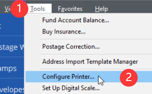 - Next, open the Stamps.com software and select "Tools" -> "Configure Printer"