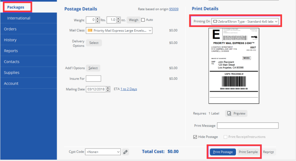- In the Packages tab, if not already selected, please select "Zebra / Eltron Type - Standard 4x6 label - roll" - Click on Print Sample or Print Postage