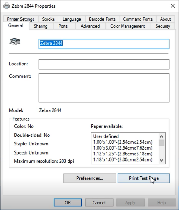 - Go to "General", click on "Print Test Page" to check the Zebra 2844 driver is installed successfully and connect the right printer