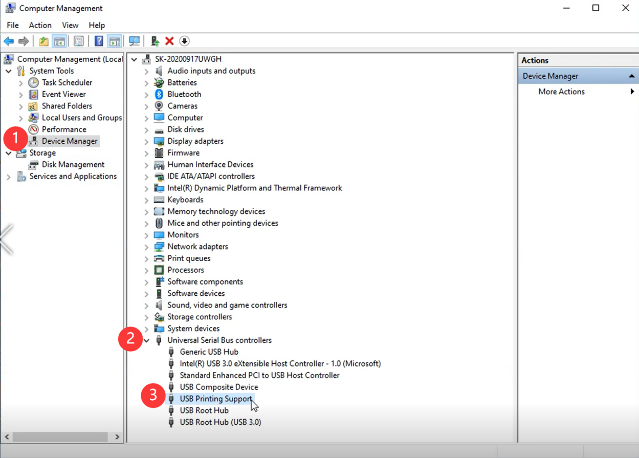 - "Device Manager" -> "Universal Serial Bus controllers" -> Double click on "USB Printing Support" to check which USB port is connected