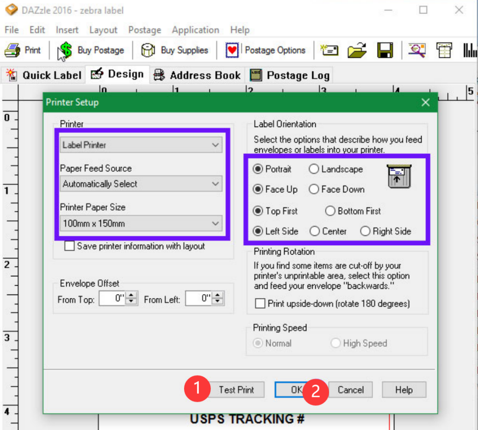- Set your Printer and Label Values as shown. Click on "Test Print." If it all looks good, click "OK."