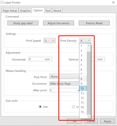 13. Set up a printer: To change the Print Speed ,Density and Size units, you can go to Option.