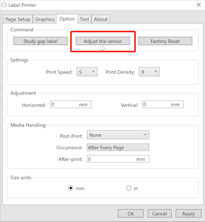 17. Unload label from your printer, click "Adjust the sensor" to adjust your printer sensor.